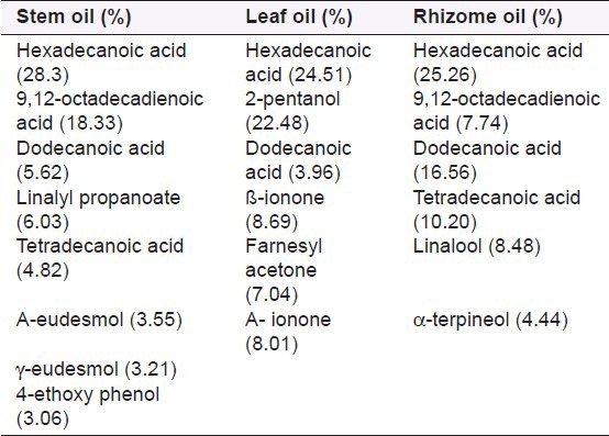 Sequential screening for phytochemicals of C. igneus leaves revealed that it is rich in protein, iron, and antioxidant components such as ascorbic acid, α-tocopherol, β-carotene, terpinoids, steroids, and flavonoids.[,] It was revealed in another study that methanolic extract was found to contain the highest number of phytochemicals such as carbohydrates, triterpenoids, proteins, alkaloids, tannins, saponins, and flavonoids.[] Preliminary phytochemical evaluation of Insulin plant (C. pictus) revealed that the leaves contain 21.2% fibers. Successive extracts gave 5.2% extractives in petroleum ether, 1.06% in cyclohexane, 1.33% in acetone, and 2.95% in ethanol. Analysis of successive extracts showed presence of steroids in all extracts. The ethanol extract contained alkaloid also. The major component of the ether fraction was bis (2’-ethylhexyl)-1,2-benzenedicarboxylate (59.04%) apart from α-tocopherol and a steroid, ergastanol.[] Stem showed the presence of a terpenoid compound lupeol and a steroid compound stigmasterol.[] Bioactive compounds quercetin and diosgenin, a steroidal sapogenin, were isolated from C. igneus rhizome.[] Trace elemental analysis showed that the leaves and rhizomes of C. pictus contains appreciable amounts of the elements K, Ca, Cr, Mn, Cu, and Zn.[] Steam distillation of stems, leaves, and rhizomes of C. pictus D. Don yielded clear and yellowish essential oils. The major constituents identified[] in the essential oil are enlisted in Table 1.