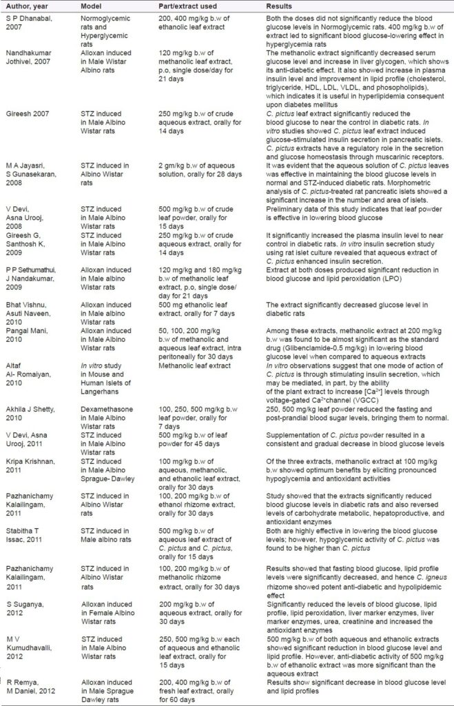 Of late, a lot of research work has been conducted to evaluate the anti-diabetic effect of insulin plant.[,,,,,,,,,,,,,,,,,,] The summary of the animal experimentations done are tabulated [Table 2]. In a cross- sectional clinical study, patients consuming either one fresh leaf or 1 teaspoon of shade-dried powder/day of C. igneus in conjunction with other modalities of treatment had effectively produced glycemic control in diabetics.[]